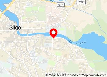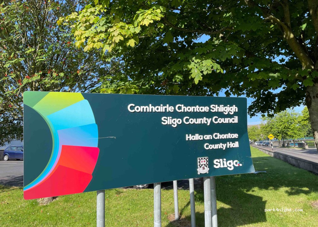 Large, spacious public car park at the Sligo County Council offices, right on the river, a short walk from the town centre. There are a few good, flat spots with wide grassy verges for large motorhomes. There is a charge Monday to Saturday from 8:30am to 6:30pm, with a maximum of 2 hours (cash only). If you arrive after 6:30pm, you can pre-pay for 2 hours for the following morning. Although there is a charge on Saturdays, a local said that no one pays on Saturdays as the offices are closed.