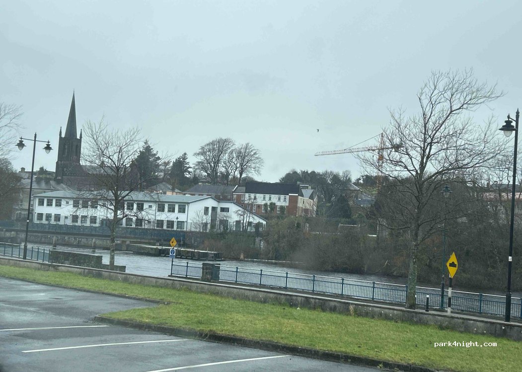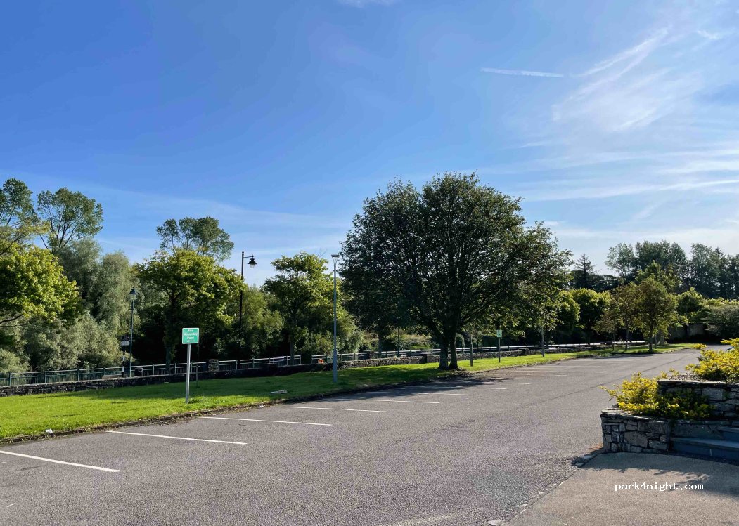Großer, geräumiger öffentlicher Parkplatz beim Sligo County Council, direkt am Fluss, nur einen kurzen Fußweg vom Stadtzentrum entfernt. Es gibt einige gute, ebene Stellplätze mit breiten Grasrändern für große Wohnmobile. Montag bis Samstag von 8:30 bis 18:30 Uhr ist der Parkplatz gebührenpflichtig, maximal zwei Stunden (nur Barzahlung). Bei Ankunft nach 18:30 Uhr können Sie zwei Stunden für den nächsten Morgen im Voraus bezahlen. Obwohl samstags eine Gebühr erhoben wird, sagte ein Einheimischer, dass samstags niemand zahlt, da die Büros geschlossen sind.