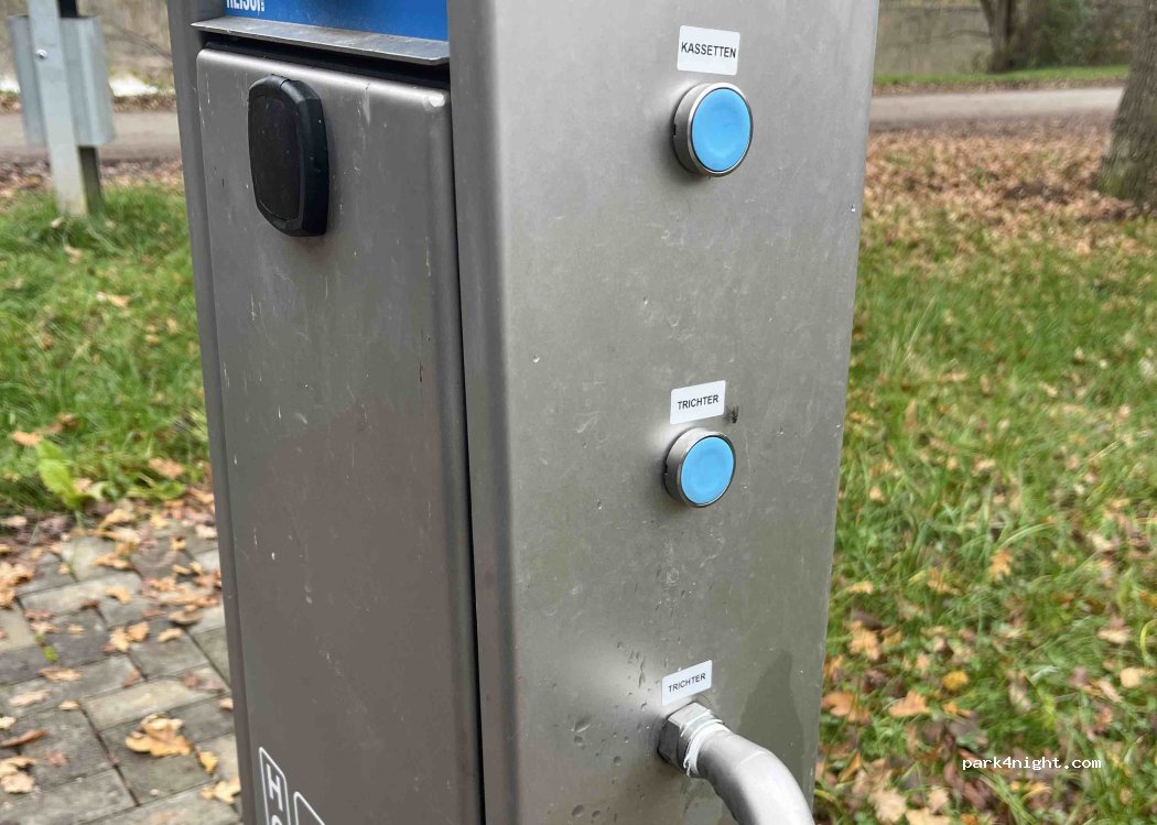 Newly installed supply and disposal facility. Black and gray water are drained via floor inlets. Fresh water is subject to a fee (€1 per 100 liters), payable by debit/credit card.
