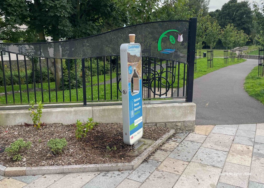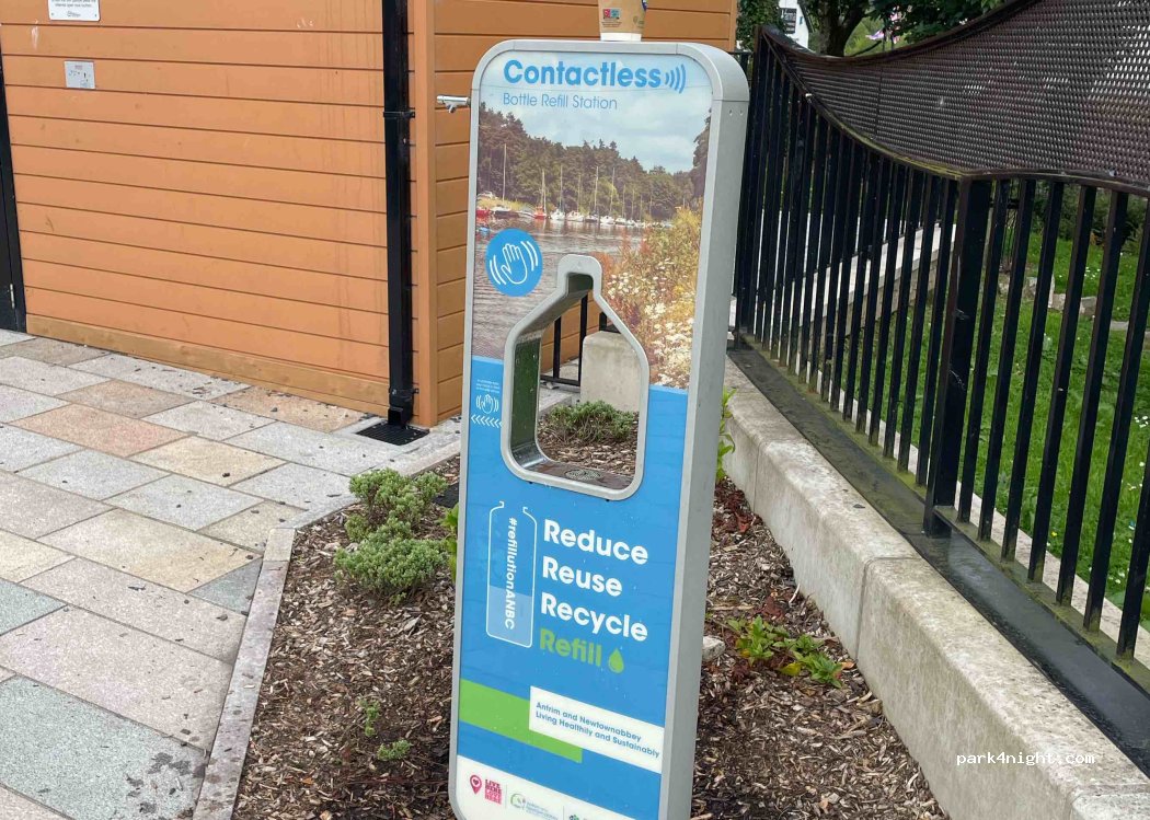 Free drinking water refills available at the entrance to Sixmilewater Park. Bottles and canisters can be easily held underneath and refilled. The dispenser is in Ballynure, about 20 minutes from the ferry in Larne.