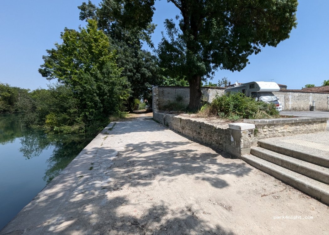 Ville morte. Aire agréable mais coincée entre 2 murs (résonance). Si on ouvre sur la Charente, ce qui a été notre cas, c'est parfait. Supermarché à 800m en suivant le fleuve en aval. Donnée pour 16 places par CCP. Je mets au défi les meilleurs pour rejoindre les services, entrer ou sortir de sa place, si l'aire dépasse 13 places le long des murs. Quant aux véhicules dépassant les 8m en PL...