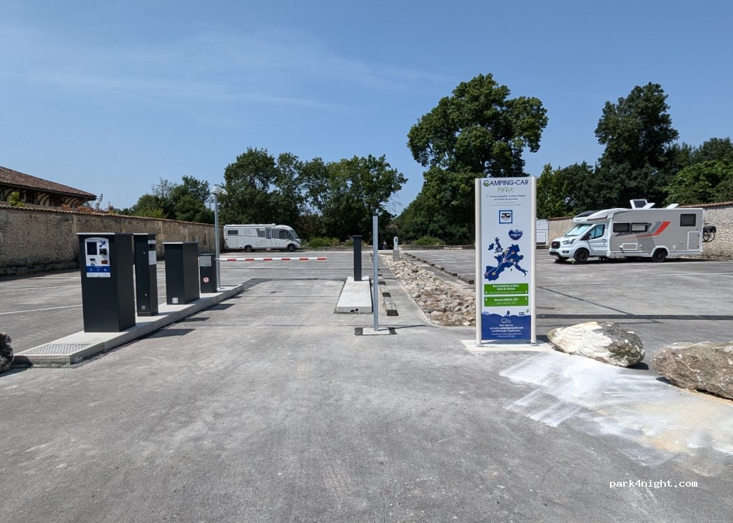 L'aire est très bien située car non loin du centre-ville et en bordure de Charente. Points négatifs : pas d'ombre, conteneur trop petit pour les poubelles ménagères (il déborde) alors que ce sont les grandes vacances. À notre arrivée, impossible de rentrer avec la carte au niveau de la borne CCP. Obligés d'appeler l'assistance...