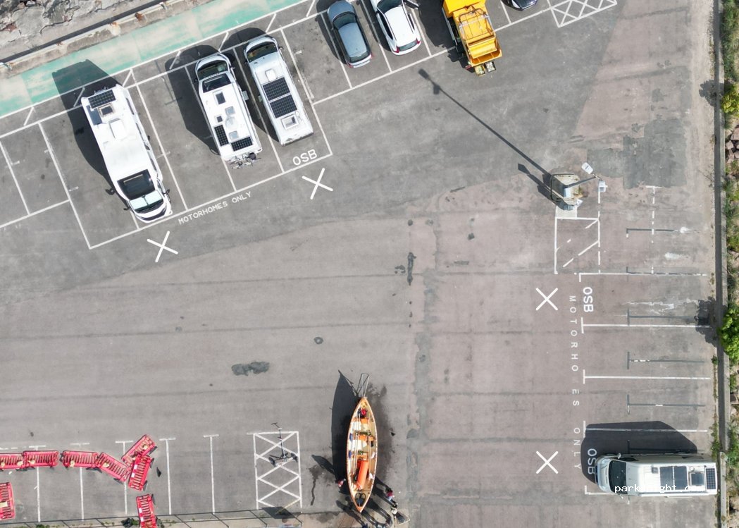 4 bays marked OSB for overnight stopping bay. The payment machine is easy to use and you just make one payment of £10 for 24hour. No bins here, but there are some on the road to the harbour. Busy with locals parking up, to watch the sea. They leave their engines running and play loud music, but they all left around 9pm.