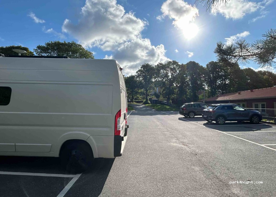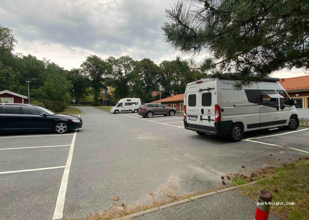 Paid 30kr for one night. Calm and quiet place. Maybe the school is closed for summer. Please leave the parking lot free from trash and don’t act like you’re camping!
