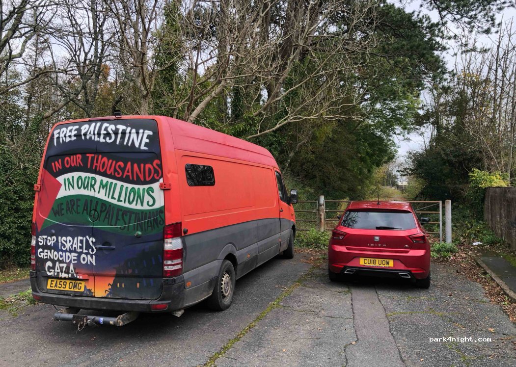 There seems to be some confusion about this park up. Yes there’s a sign by the gates from when the road was first blocked off. That’s not enforced though. But there is also free parking just meters away on the Curb side with zero restrictions. I’ve used this spot several times and find it peaceful, quiet & nicely out the way yet super convenient for town & the train. I still recommend this spot.