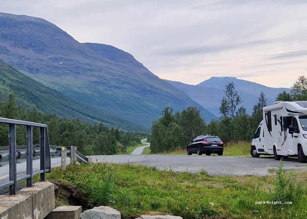 Roadside parking space, surrounded by mountains, on the banks of a river.