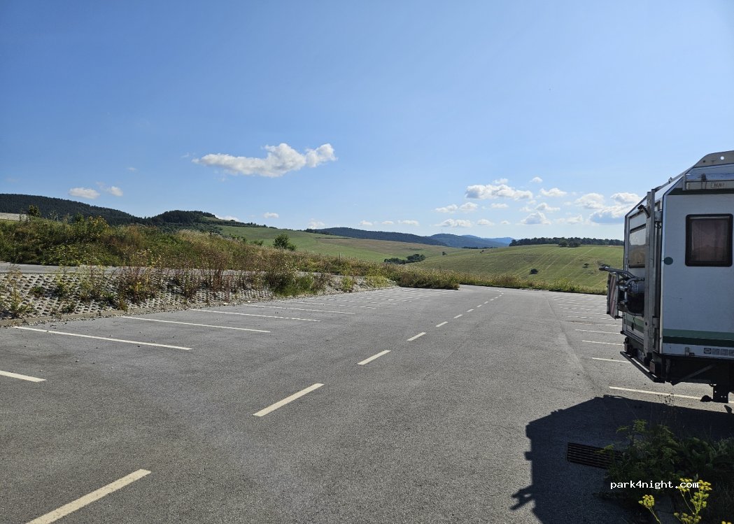 Grand stationnement, légèrement en pente, asphalté, pas d'ombre