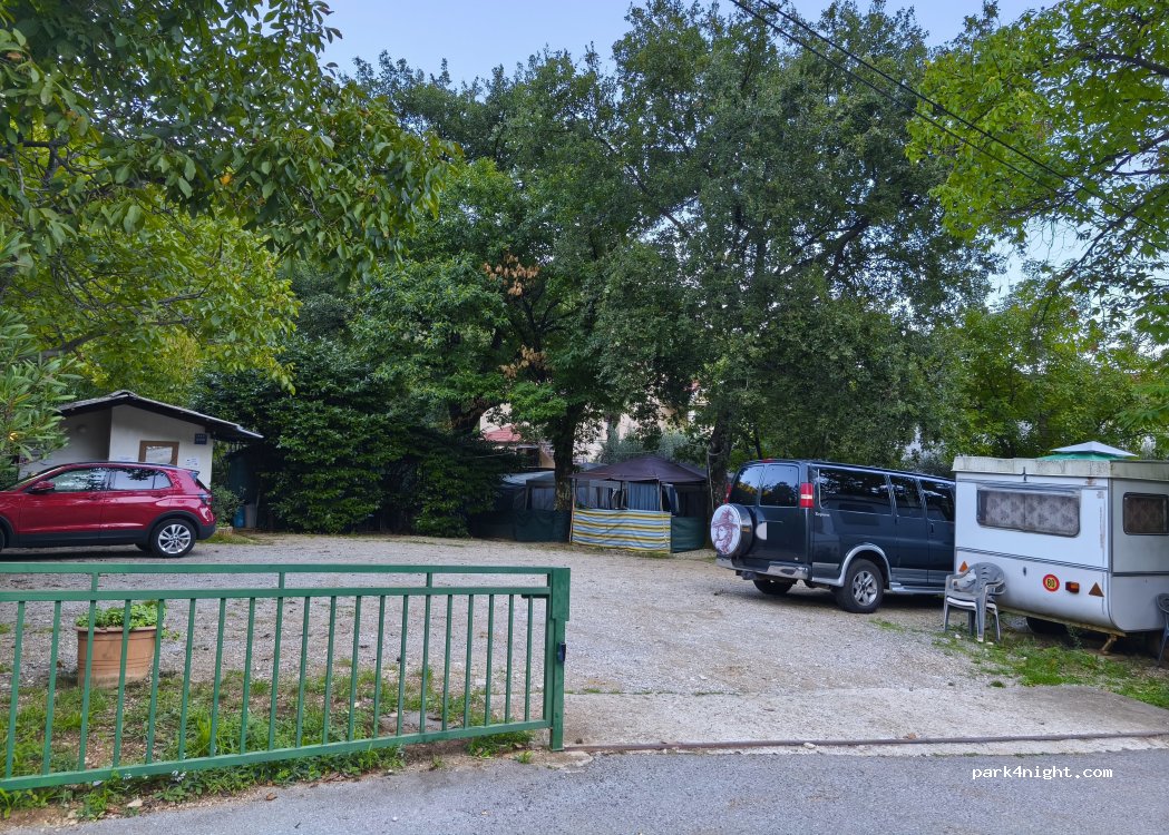 A very friendly welcome. Even though it was already late and she had no space available, she found a solution for us. We were allowed to park in the adjacent parking lot with her 7m campervan. Upon arrival, she provided me with a roll of toilet paper and a garbage bag. The 3-star Jasna Dundovic mini-campsite is very clean throughout and quiet at night. There's an area with a grill and covered picnic tables where you can eat and cook freely. The entrance is a bit narrow, but we had no trouble with a 7-meter campervan. There's also an area for washing dishes and laundry, a small washing machine, and a water tank. PLEASE NOTE: YOU CAN ONLY PAY IN CASH.
