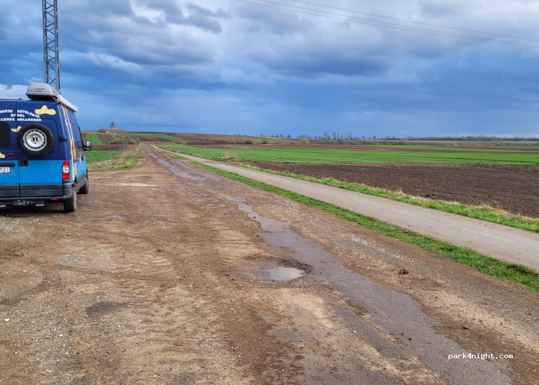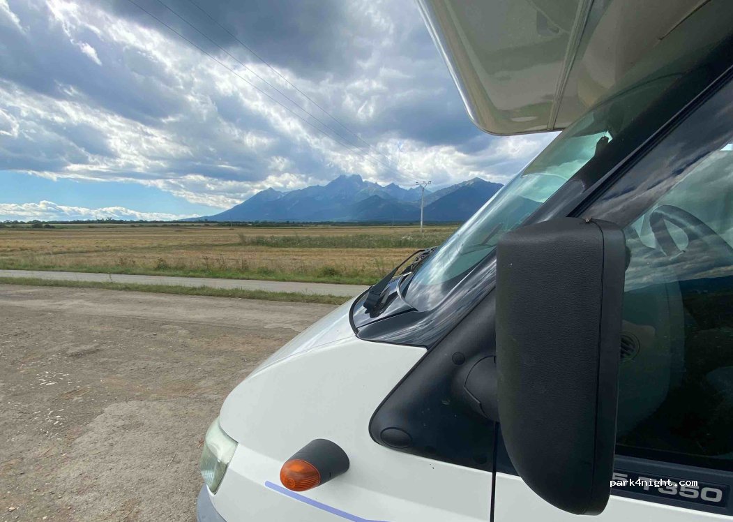 Small parking on a empty and closed road, nothing special, but with a spectaculous view ona Tatra Mountains. Only some bikers moving during the day.