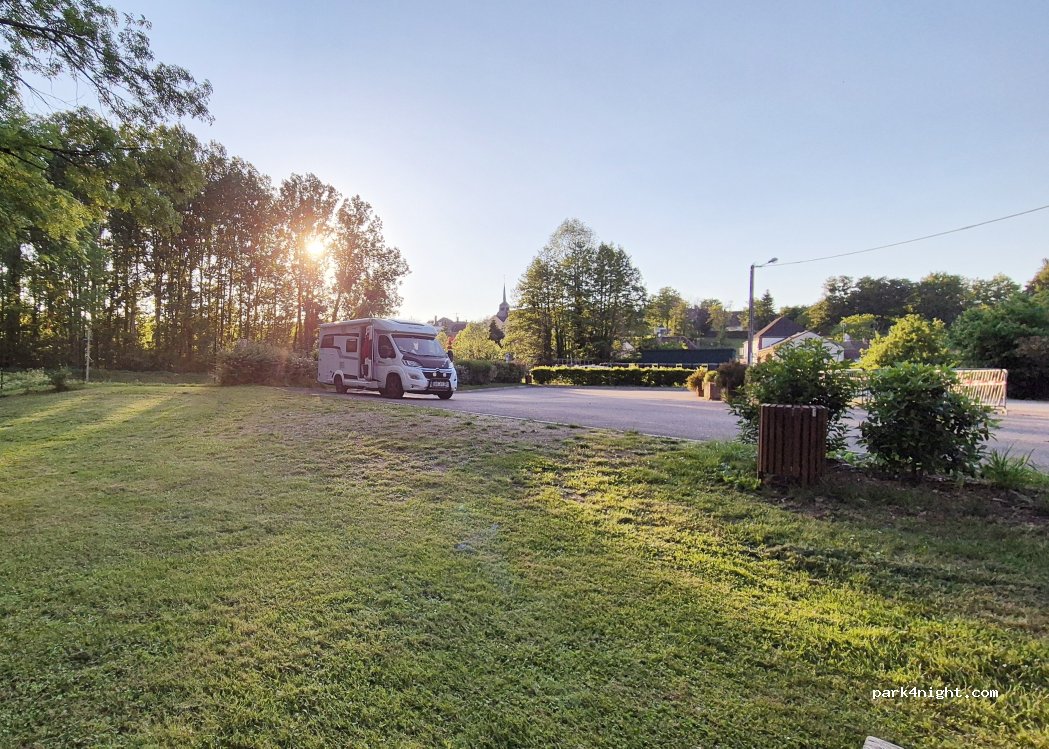 petit endroit très sympathique au bord d une départementale peu fréquenté...un cours d eau et un ancien lavoir a proximité... parking partagé je pense avec les voitures du voisinage...borne a eau électricité et eau usée ..jeton a prendre en mairie..je recommande pour le cadre et le calme..merci a l équipe municipale