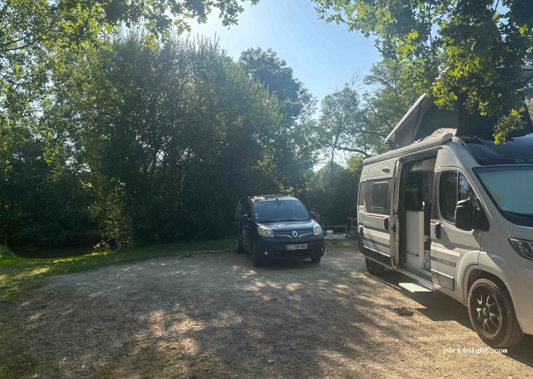 After the municipal campsite and the camper van area, location for a van or converted van, along the Sarthe. No ban or height limit, flat location. Note the proximity of a railway line but the distance means that the nuisance is very limited. No passage at night. Picnic table and fishing possible.