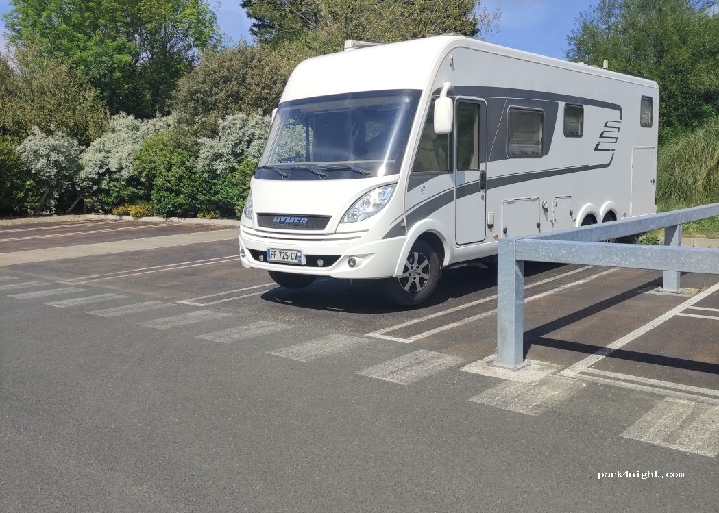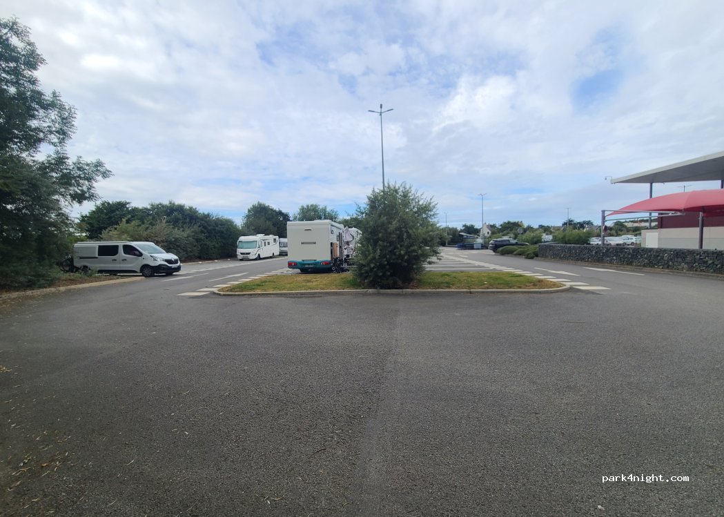 Parking de dia tolerat pel supermercat. A la dreta de la porta del supermercat hi han places una mica més grans i moltes autocaravanes i campers (sembla un àrea A/C). Llàstima que alguns ocupen més d'una plaça... bastant ple a l'agost però hi ha lloc. Ideal per fer la ruta de la Côte de granite rosa.