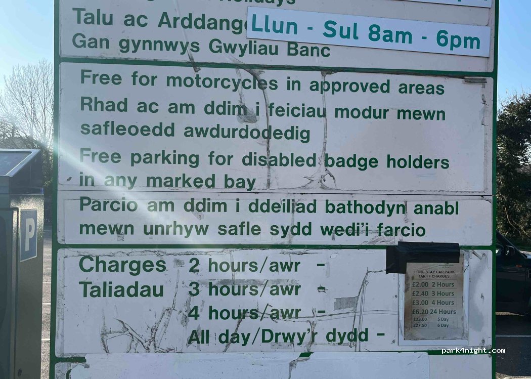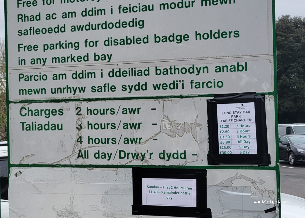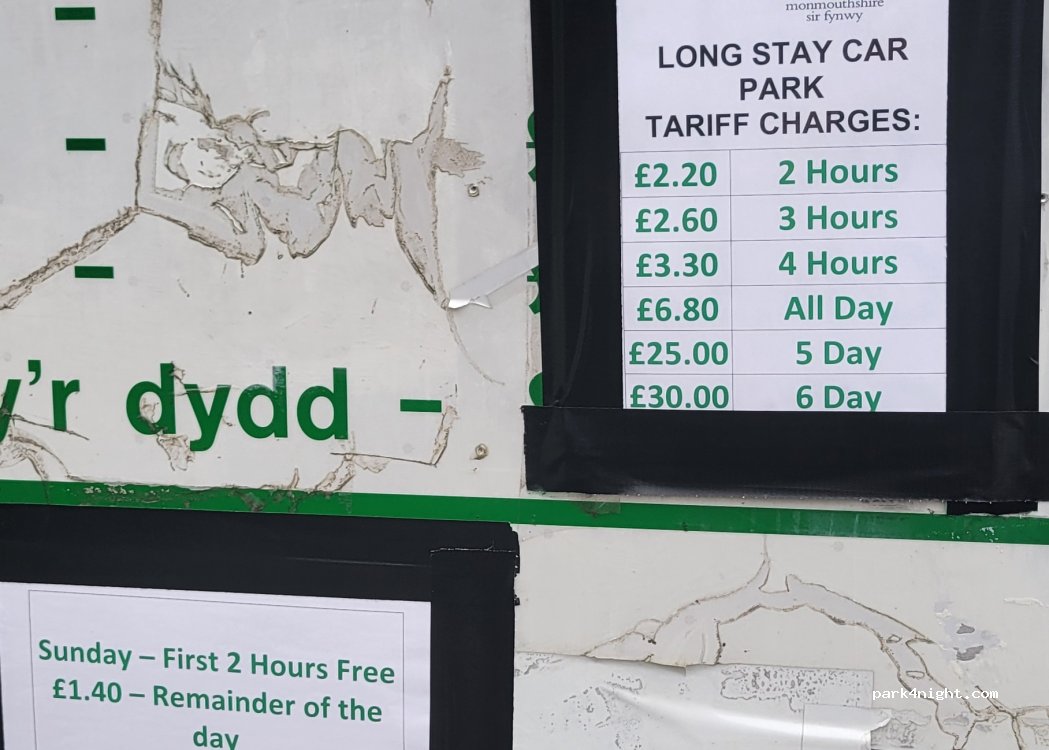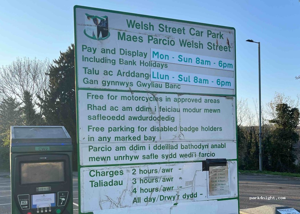 Aparcamiento de Welsh St. Aparcamiento municipal 24 horas. £6,20 por 24 horas. Gratis de 6 p. m. a 8 a. m. largos espacios que sobresalen del césped al final con vistas al castillo de Chepstow. ASBO se da cuenta de que tal vez sea ruidoso por la noche.