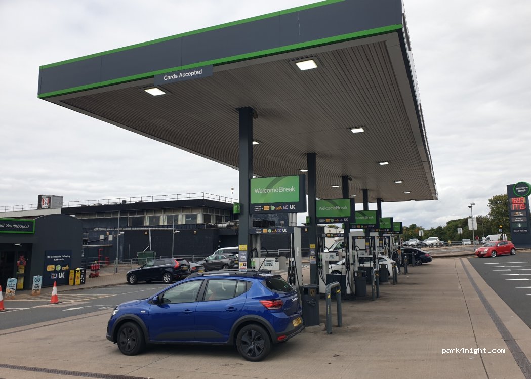 Rest area on the highway. For a free shower, enter the black building and ask at the WHSmith ticket office for the shower key.