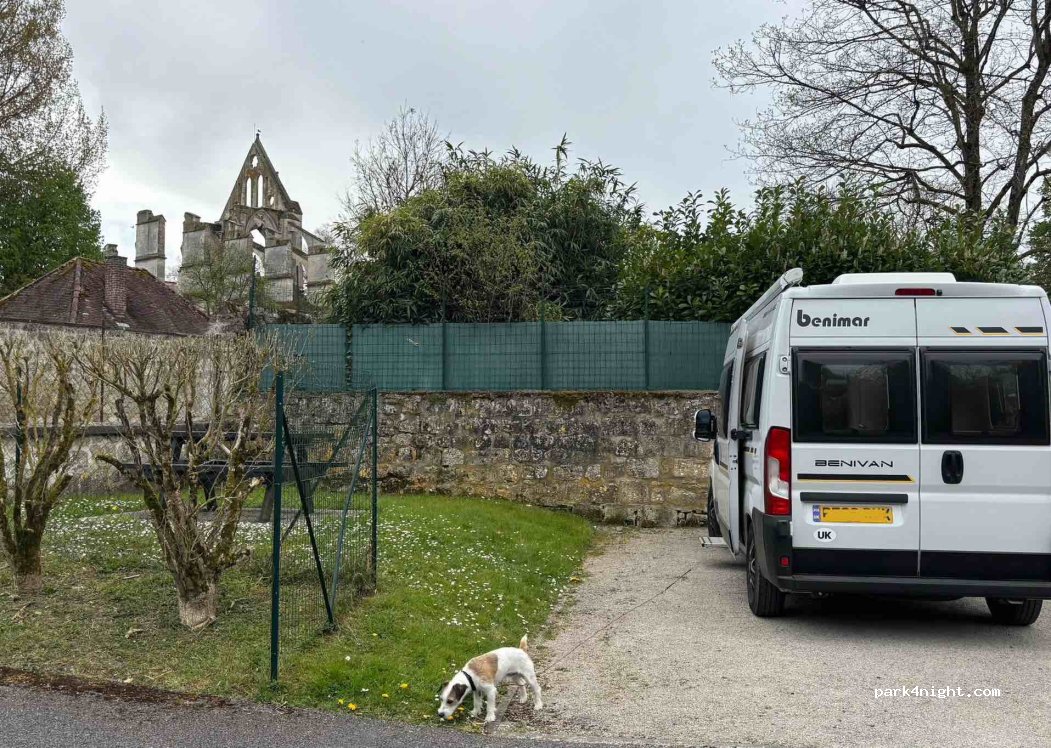 Lovely little aire (3places) close to road but not too busy, goes quiet at night. No services, No bins but two picnic tables available, Close to Abbey ruins and village centre with quaint atmosphere and buildings. No shops but to bars/restaurants. Thanks you to the commune for providing such a great amenity. benivanadventures
