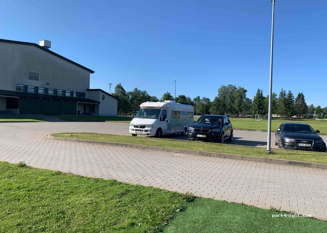 Parking near a sports hall and skateboard park. Very good for one night, flat and quiet, a few cars passed, no service.
