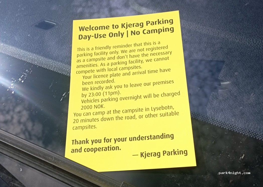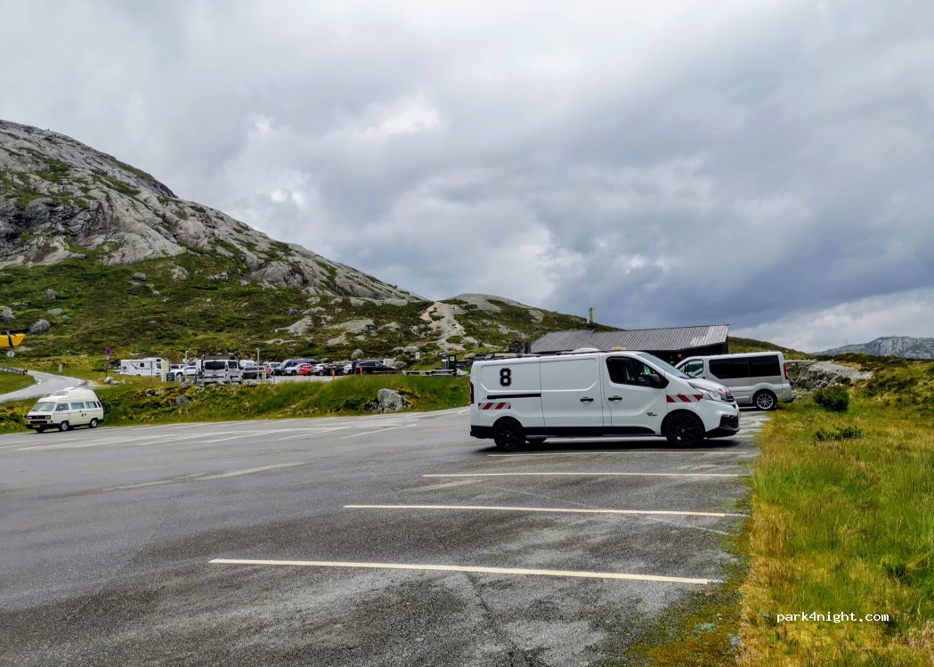 Bertan lo egitea debekatuta dago. Kanping dendarekin igo ginen Kjeragera eta kotxea aparkaleku honetan utzi genuen: 300NOK/24h. Informazio bulegoan esan genuen furgoneta bertan utziko genuela gauean eta ez dago arazorik. Komunak daude.