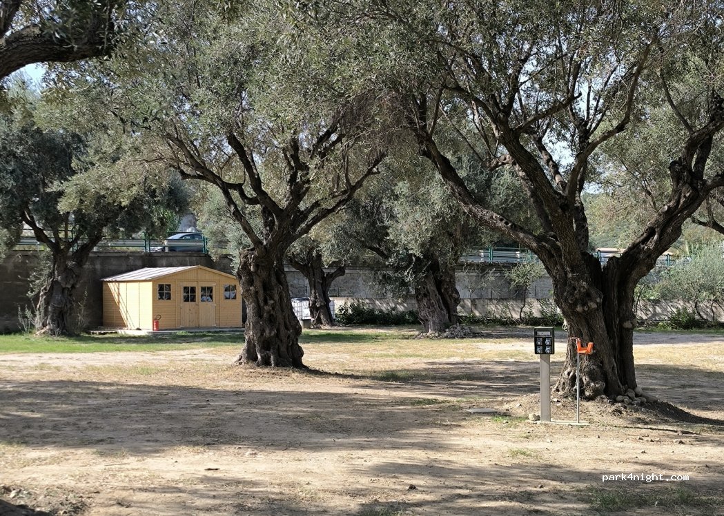 aire tres bien 10€en ce moment électricité 3amp. sanitaires propres lave linge ok 2€ merci a Roberto qui vous explique tout. le portail ferme donc sécurité. boulangerie a 150m extra. parmi les oliviers agréable