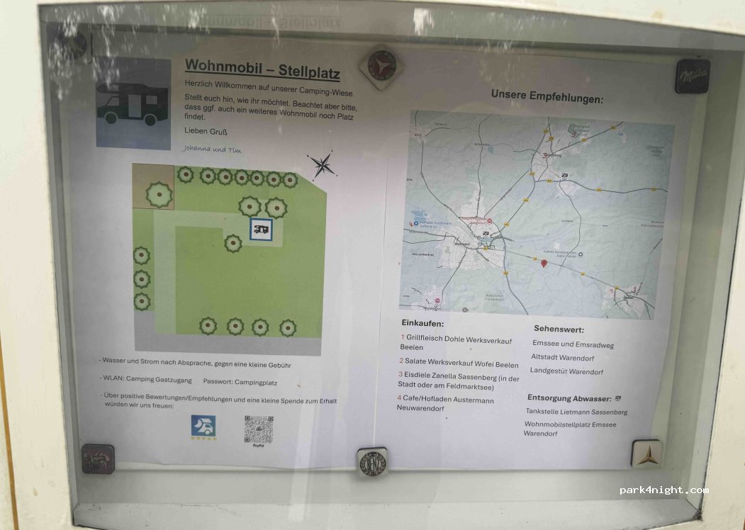 Wir bieten einen Stellplatz für bis zu drei Wohnmobile neben unserem Hof mit einem tollen Weitblick über Felder. Sie stehen auf Rasen. Der Platz ist teilweise schattig. Die Stellplatzwahl kann frei erfolgen. Der Platz befindet sich in einer Bauernschaft die dem Ortsteil Warendorf angegliedert ist. Die nächste Einkaufsmöglichkeit ist 3 km entfernt. Der Weg zur nächsten Pizzeria beträgt 4 km. Wir befinden uns 5 km von der Warendorfer Altstadt entfernt. Diese ist mit dem Fahrrad oder dem Auto super zu erreichen. Trinkwasser und WLAN bei Bedarf möglich.Im Winter und bei viel Regen nur bedingt befahrbar. Anfragen gern im Voraus per Mail Telefon oder WhatsApp ! Über eine Spende zum Erhalt des Platzes würden wir uns freuen.