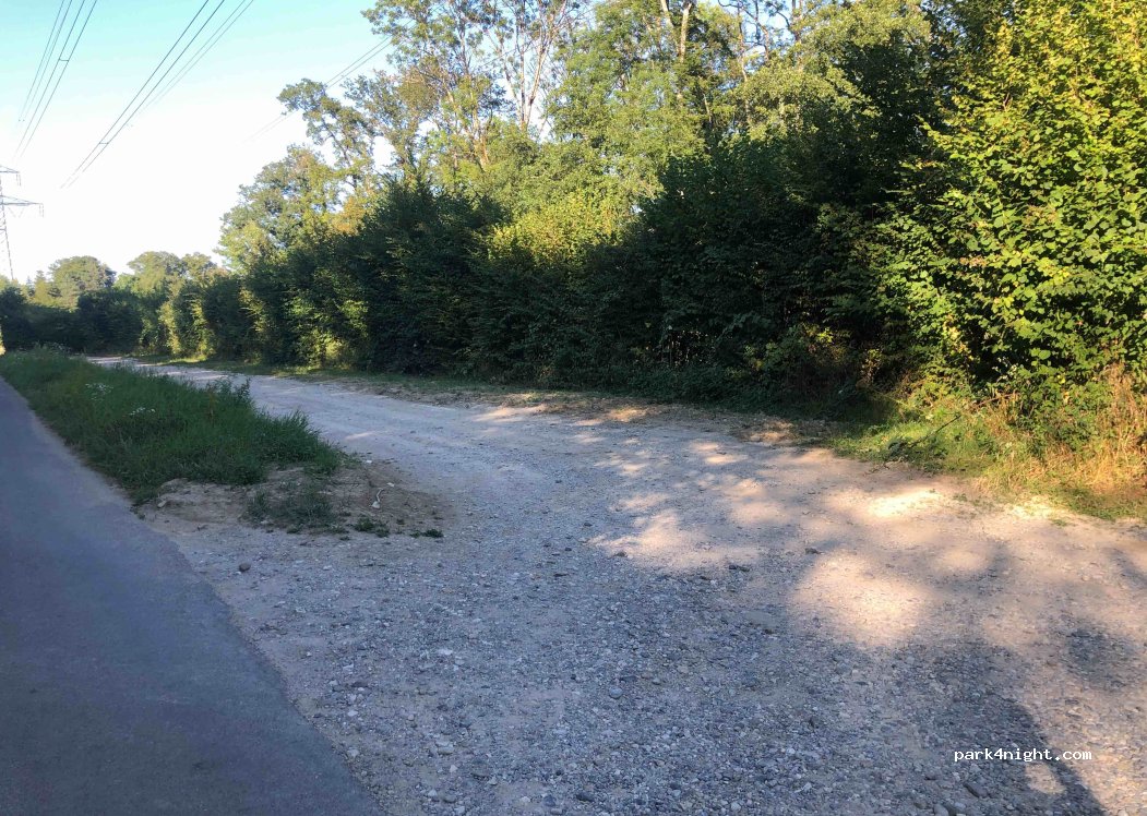 Schotterparkplatz an einer ruhigen Straße. Unter einer Stromleitung. Kein Camping.
