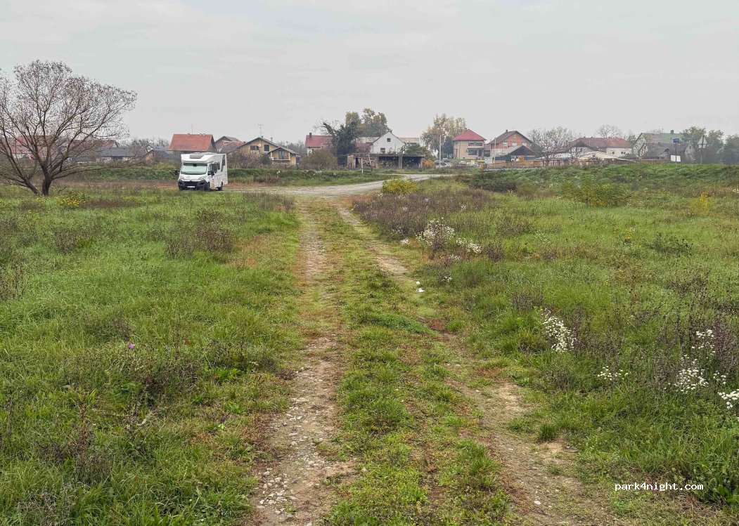 Pequeño aparcamiento de grava sin servicios al lado del lago Banovsko (Banovsko jezero).