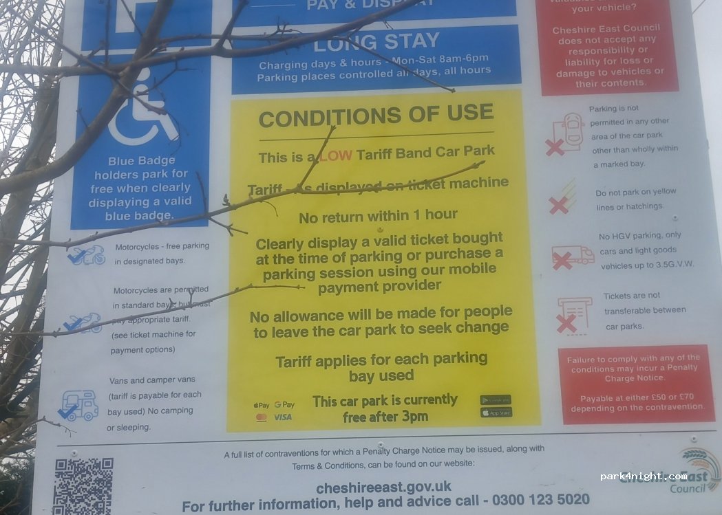 Now pay and display, free from 3pm mon to sat, free on sunday. ok for campervans but can not sleep in vehicle over night.