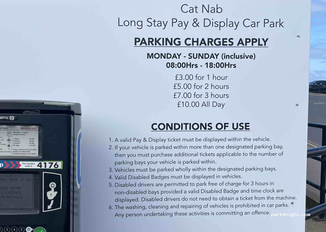 Loverly place to stay over night, Pubs and fish shop nearby, 2 min walk to the pier, I go there every few months . £4-00 from 8am to 6pm then free overnight. Toilets open through the day and rubbish bins