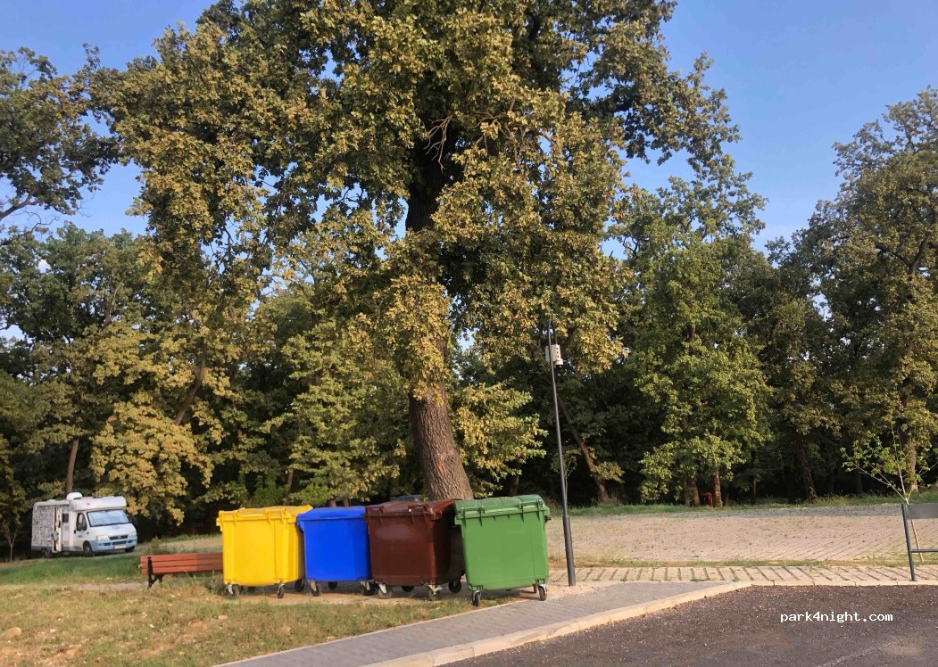 Pequeño aparcamiento al final de la calle con cubos de basura separados. Buena vista y tráfico tranquilo. Parque con bancos cercanos.