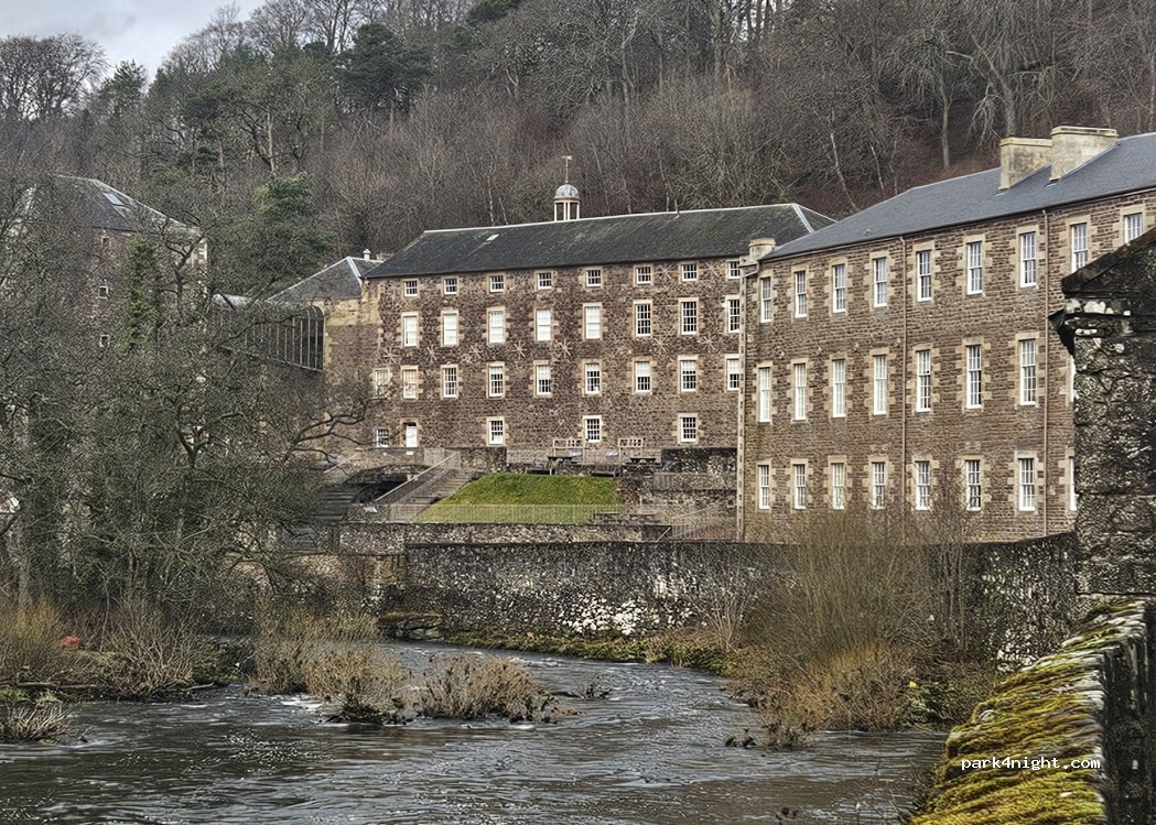 Worth the £3 car parking fee to explore the UNESCO heritage site and walk to the Falls of Clyde. Car park was quiet over night however the lighting is really bright so make sure you have good blinds!!