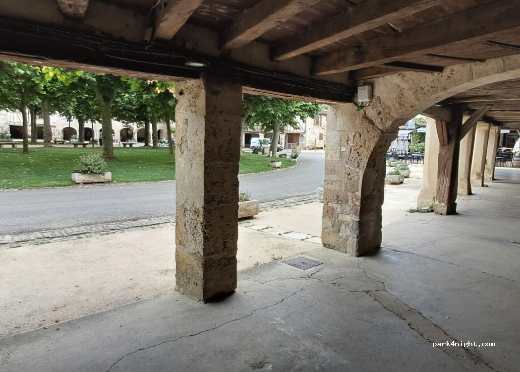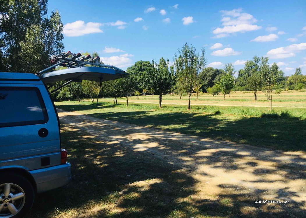 De l’autre côté du cours d’eau par le « chemin de promenade » en véhicule ou par le petit ponton à pied, se trouve l’air de camping car avec point de vidange et remplissage ainsi que des bornes de branchement électriques. Il vous en coutera 10€ par nuit. Vous pourrez être importunés par le bruit lié aux animations du village ou par la proximité de la route bien que peu fréquentée…