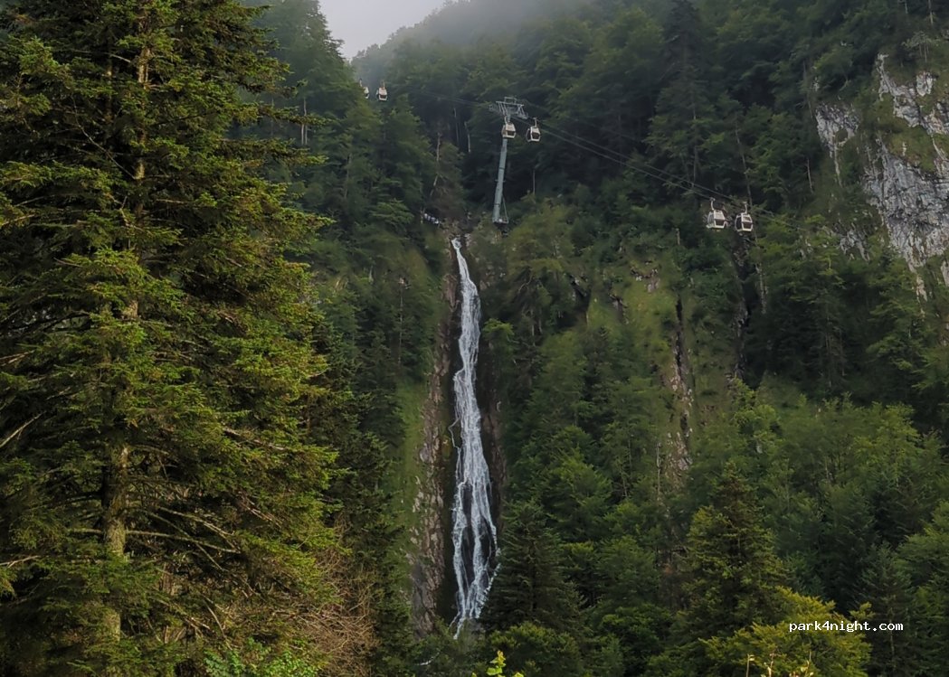 Summer parking lot with almost no people and with beautiful views of the waterfall. Quiet place.