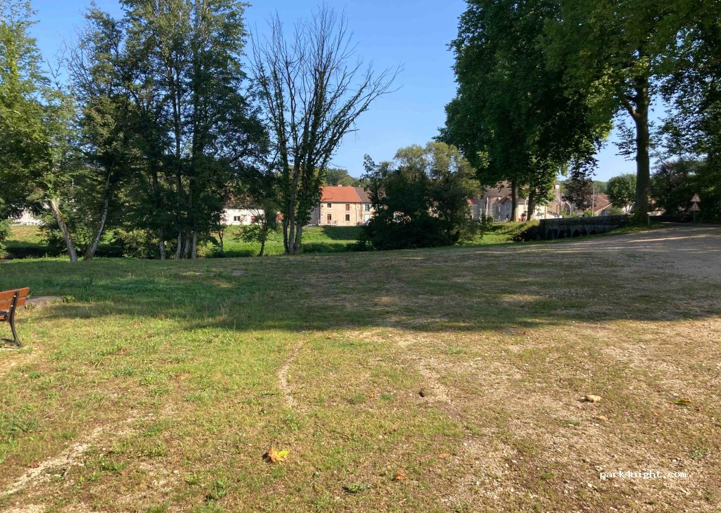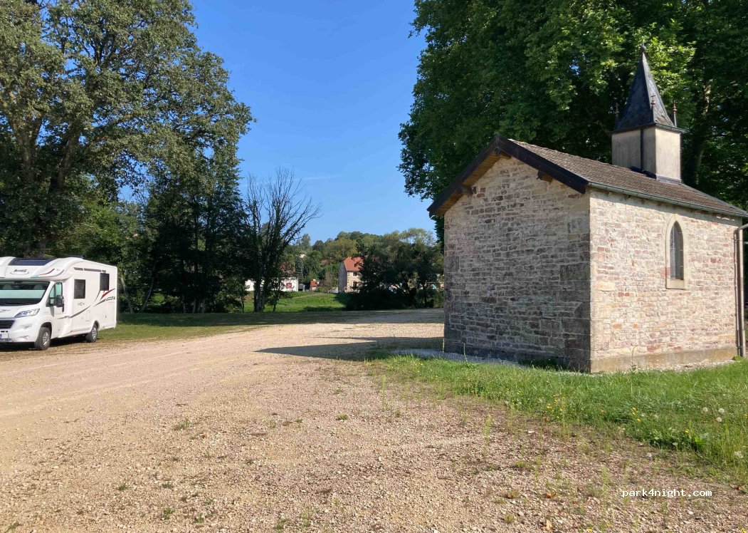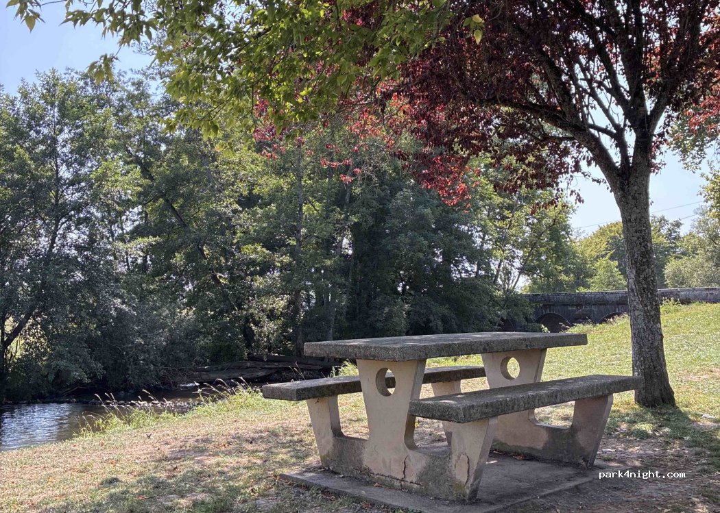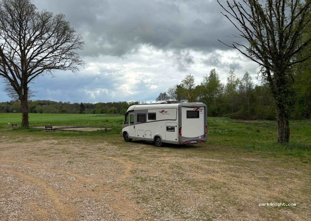 Großer, ebener, kostenloser Straßenparkplatz, kein Wohnmobilverbot, geschottert, Badestelle am Flussufer, direkt am Kanalradweg „Voie Blaue“. Achtung: Maximale Belastung 3,5 t. Picknickbänke auf der anderen Seite. Nicht probiert, aber sehr schön.