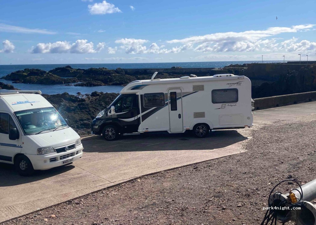 Amazing find with stunning views. Lovely cafe serving food and drinks til 4.30 in the centre of the harbour. Beautiful walks on the coastal path nearby. Village of Coldingham around a mile away, within easy walking distance has two village pubs. Please put your £15 in the harbour masters honesty box, the proceeds go towards the local lifeboat. We have a 7.5m motorhome and it wasn’t a problem. Would definitely stay again.
