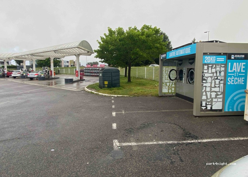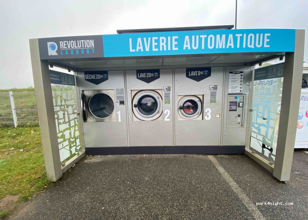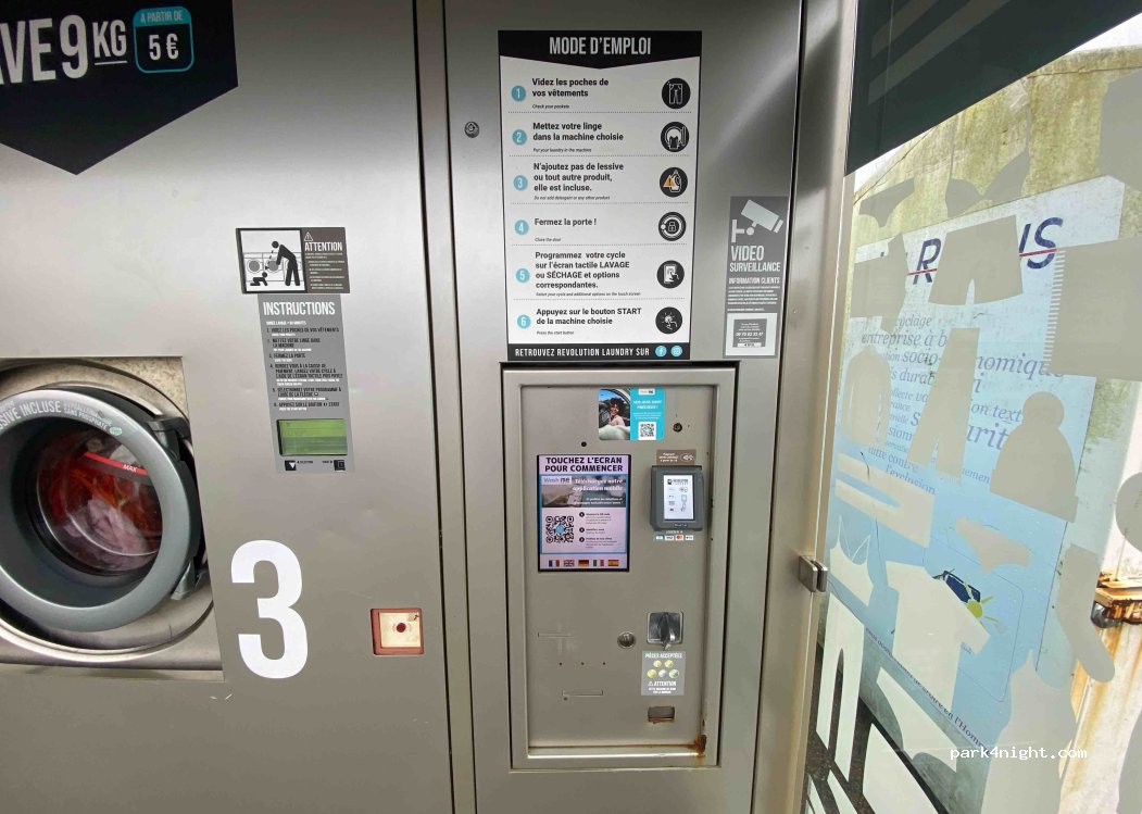 Lave-linge Revolution. Beaucoup de stationnement car il se trouve dans le supermarché E. Leclerc. 90% du stationnement est couvert mais notre MH de 2,8 m s'y est installé sans problème, voir photo.