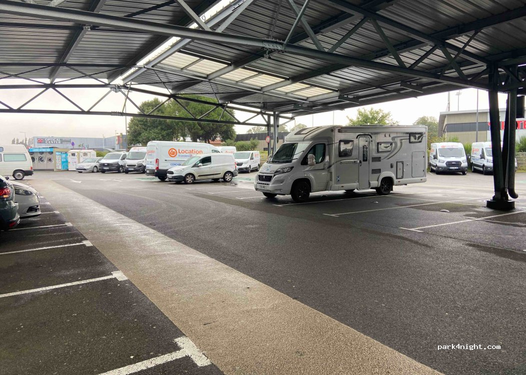 Revolución de la lavandería. Hay mucho espacio para aparcar, ya que está en el supermercado E. Leclerc. El 90 % del aparcamiento está cubierto, pero nuestra camioneta de 2,8 m se instaló sin problemas (ver foto).