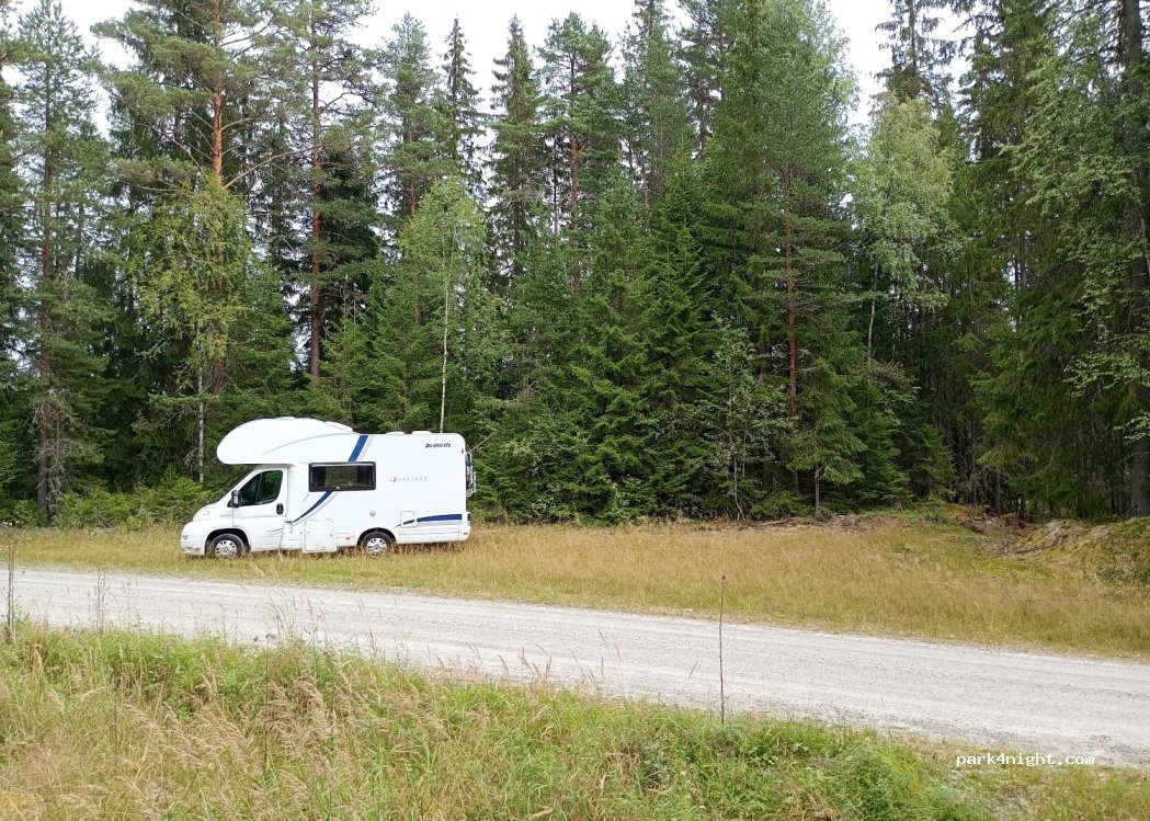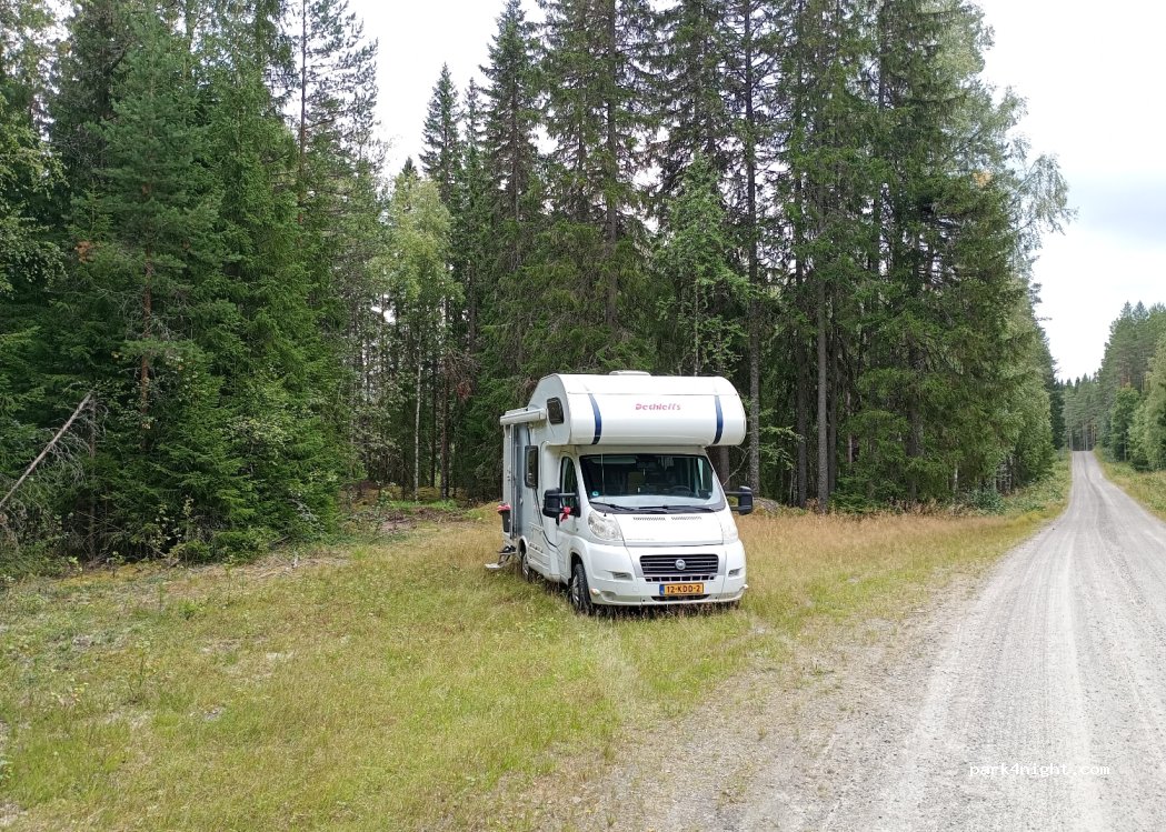 Platz für zwei Wohnmobile mitten im Wald. Ziemlich eben. Lange Fahrt auf Schotter. Aber keine Unebenheiten. 4g minimal. Elchgeräusche.