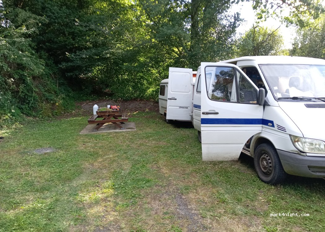 Kleine parkeerplaats voor dag en nacht mogelijk tussen 3 en 4 goed bepakte voertuigen met picknicktafel, enkele auto's maar rustig met mooie wandelingen te doen, geen serviceterminal.