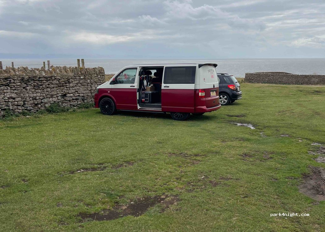 Grassy area off of cliffside road. Ocean views with lots of sheep - dogs must be kept in control and on lead. Establishment nearby. No signs up for any restrictions that can see.