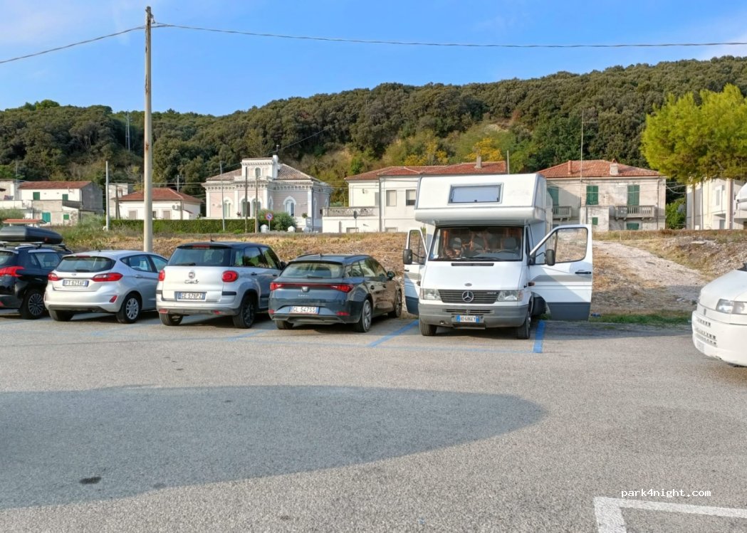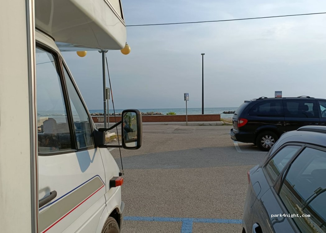 Parking calme face à la mer (belle plage de galets). Gratuit la nuit. Il y a une fontaine pour le chargement de l'eau, des douches. Accolé à la piste cyclable des Trabocchi (location de vélos à 50m). A proximité bar, pizzeria, primeur, glacier