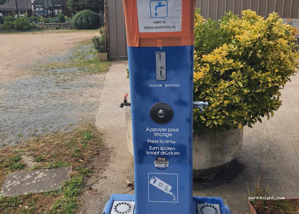 Nuit très calme, étape idéale pour visiter la Vallée des Saints à 8 km. Terrain quasiment plat, inutile de caler. Borne fonctionne parfaitement, il faut impérativement 2 pièces de 1 EUR pour l'eau. Tri sélectif sur place, très propre. Un grand merci à la commune et ses habitants accueillants !
