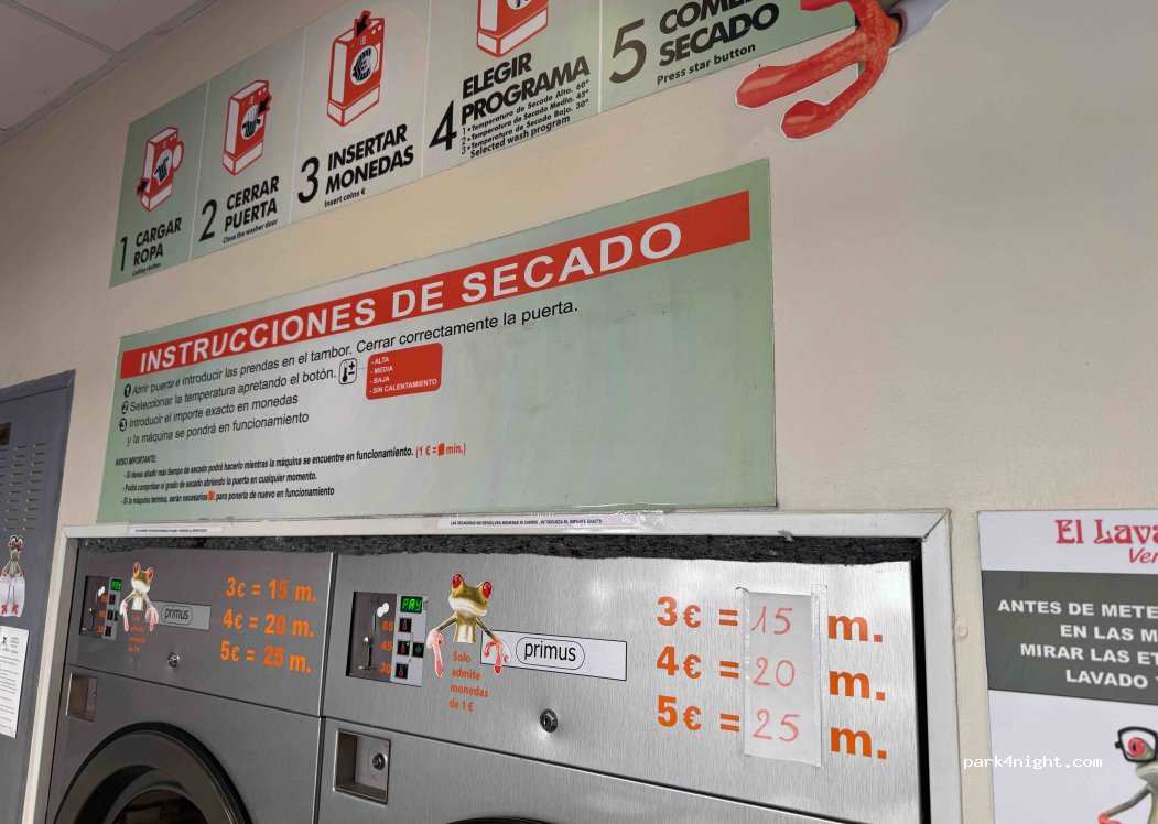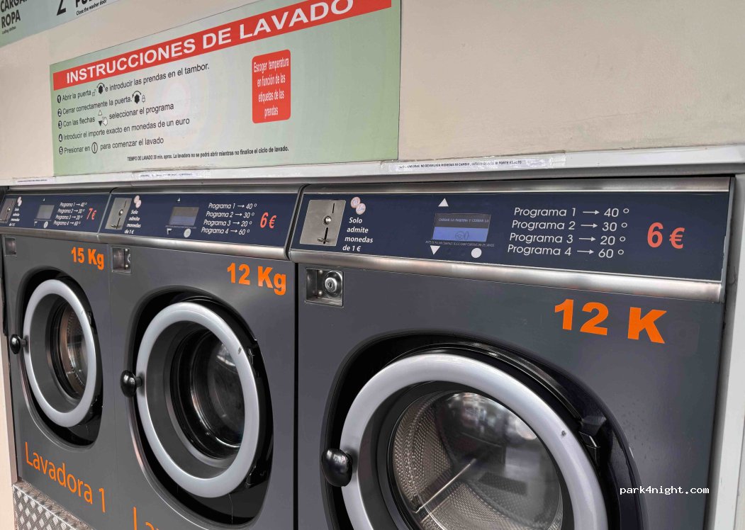 Lavar se lava, però en mi caso he puesto la lavadora del medio y la ropa ha salido más o menos limpia, pero sin olor alguno de detergente o suavizante. Es como si se hubiera lavado con agua sola o con muy poco detergente (no sé si para reducir gastos). Por tanto, si quieres que tu ropa salga impecable, éste no es tu sitio. Para terminar, aparcar furgonetas o AC cerca es practicamente imposible.