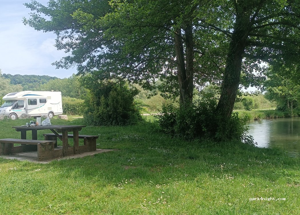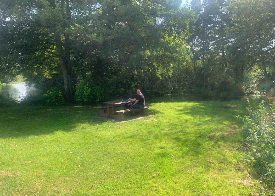 Beautiful spot between fishing lake and river. Picnic bench and litter bin. Space where previous bbqs. Gloriously peaceful here. Places to pull over all along the road.