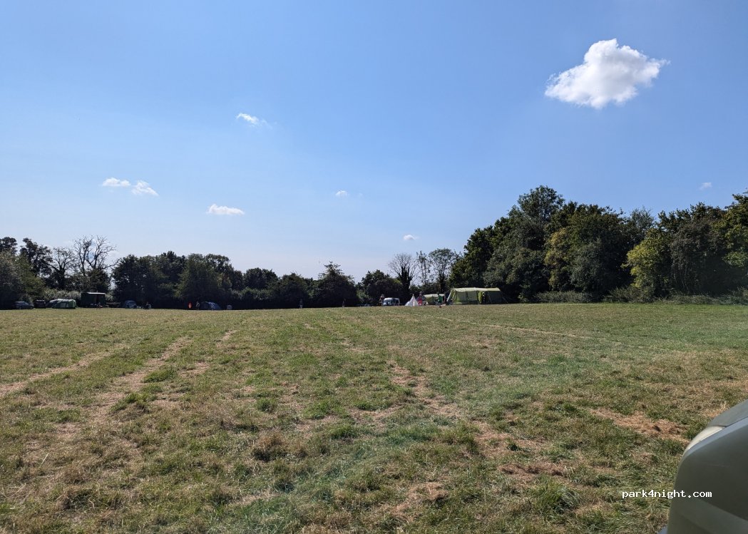Large field lined with trees, doesn't feel cramped close to other campers. Tents, caravans, van conversions, etc all welcome. Not sure if dogs are allowed.