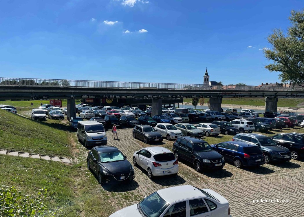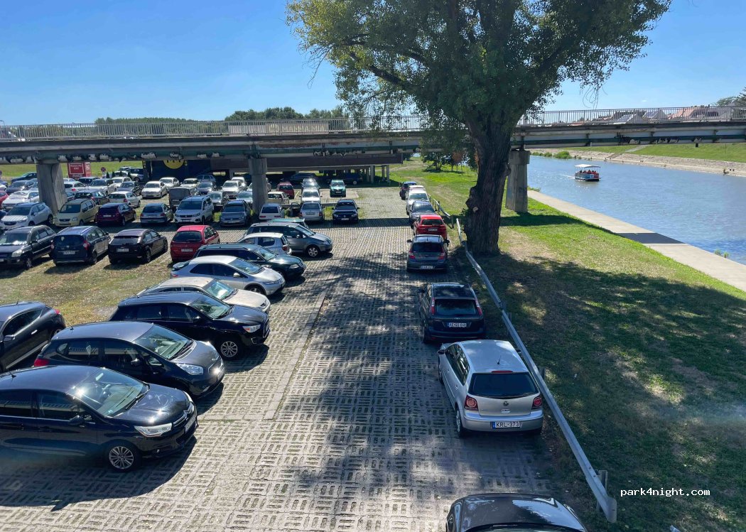 It’s a chaotic parking lot but there always seems to be cars coming and going so if it’s full just try again in a few minutes. I spent one night there, there are no services but walk north along the river for a few minutes and there’s a 200 Forint toilet. I slept right under the bridge and the traffic noise wasn’t bad. Great location for wandering around town too.