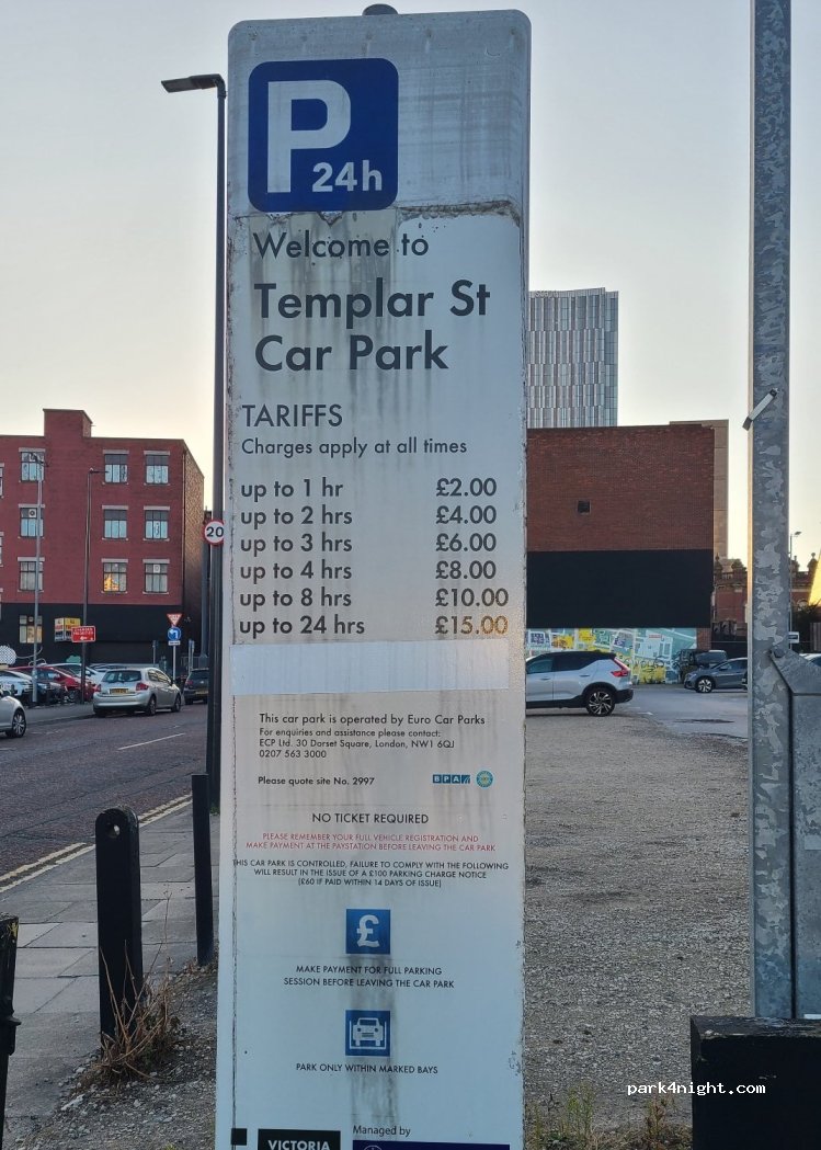 Templar Street Car park (as opposed to Templar Road on-street parking). A large carport on a fairly steep slope and very uneven surface, bit a very convenient car park for Leeds city centre. Grand Theatre is about a 7 minute walk.