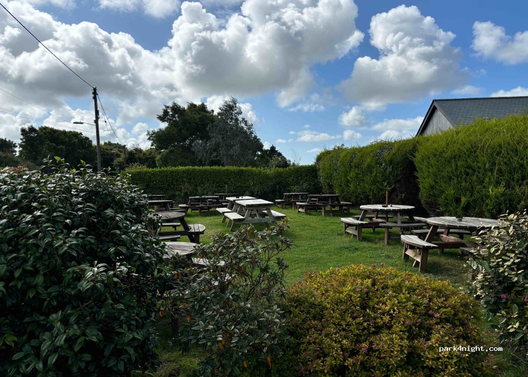 V nice, friendly pub, excellent pizza bases and vegan cheese option. Other food v good too. Parking £10 for a night. We did use the shower which was an en suite room that hadn't been booked. I would phone ahead to make sure you can use one. There are big bins on the car park for recycling and general waste. Basic car park and slopes a fair bit. Great for Port isaac and I will use again 100%.