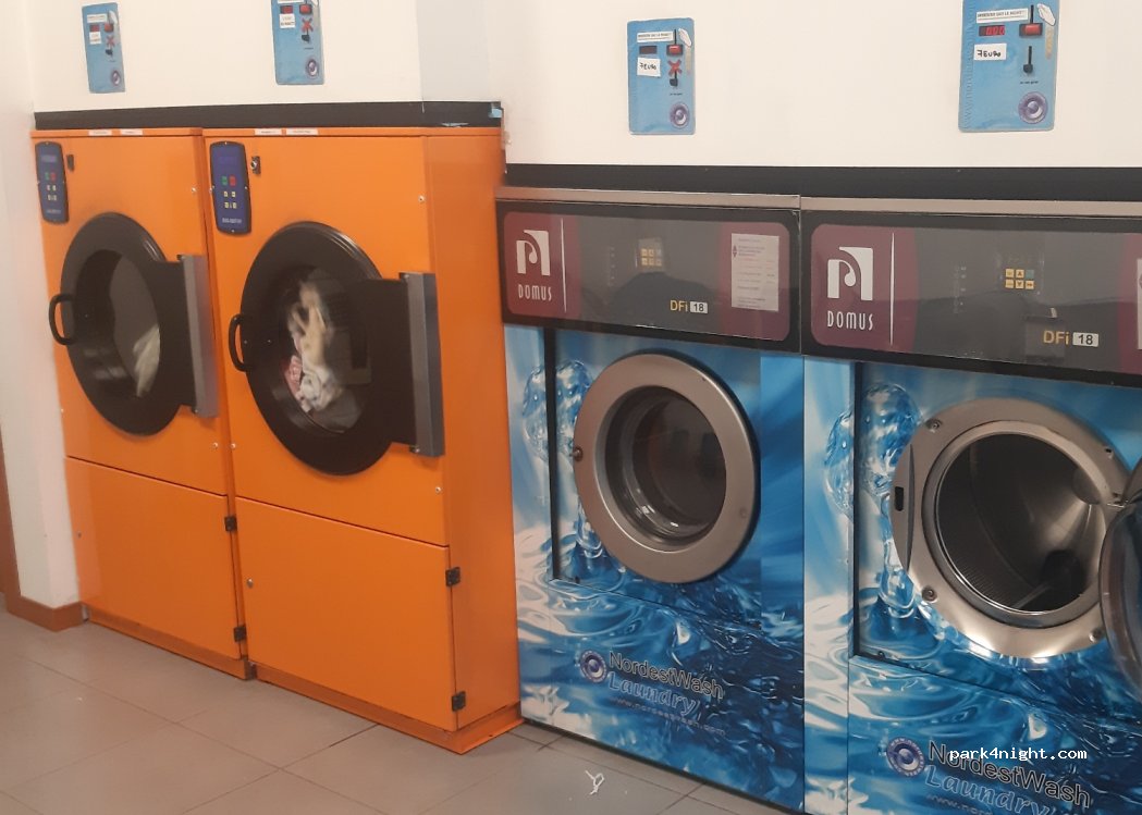 Laverie automatique (€) avec sèche-linge. Elle est située dans le bâtiment du restaurant pizzeria Vannia et il y a un petit parking devant.