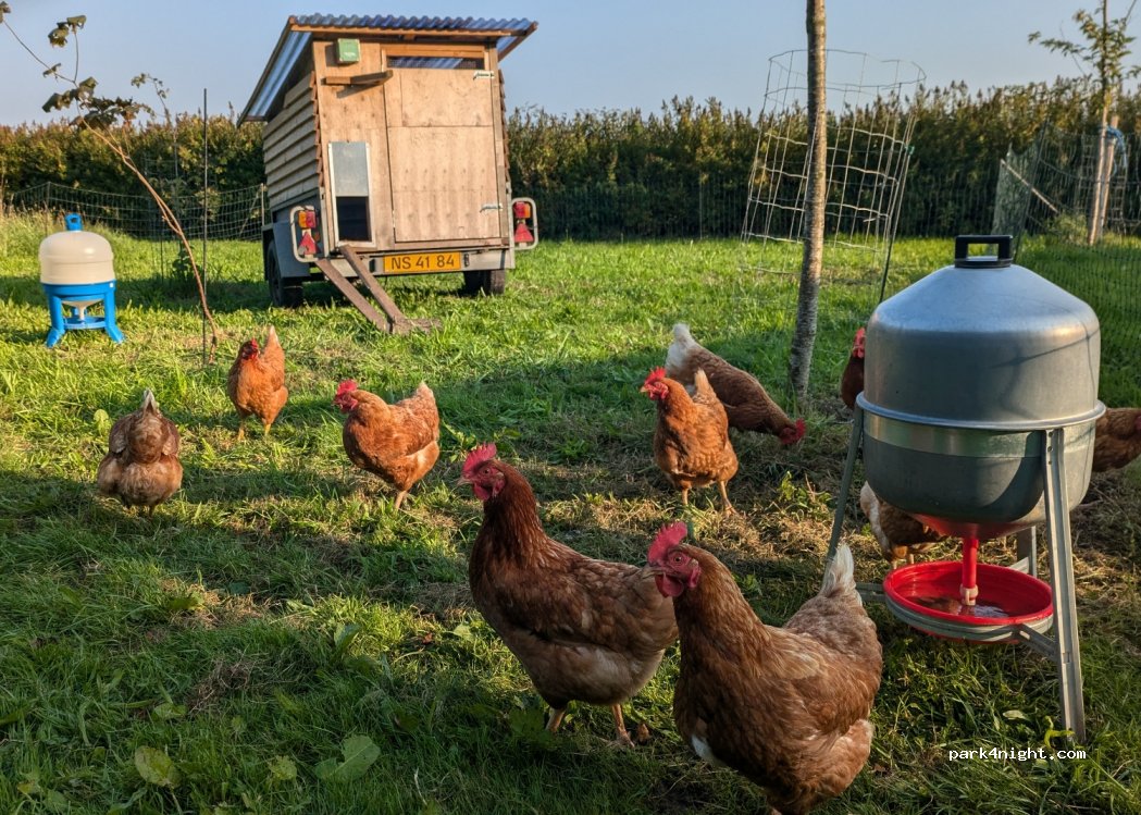 Fahren Sie rechts von der Garage entlang der neu gepflanzten Hecke vor und parken Sie links unter den Nadelbäumen gegenüber dem Hühnerhof.