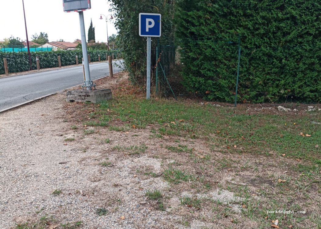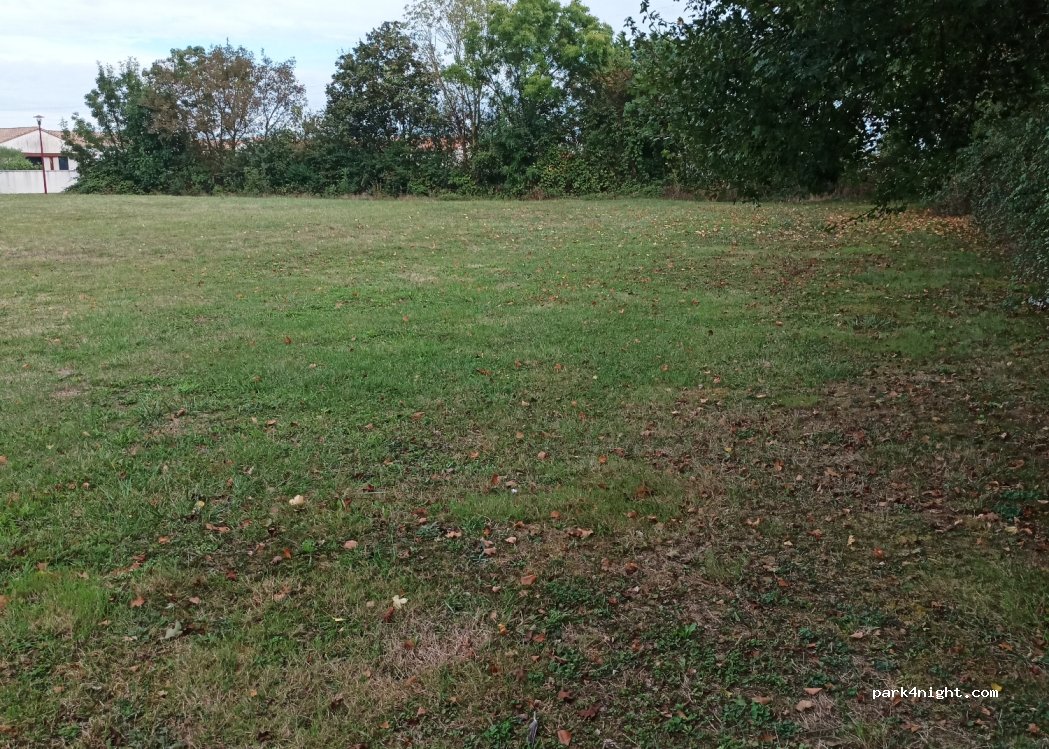 Grand parking isolé de la route par des haies. Rien n'indique d'interdiction pour les campings cars