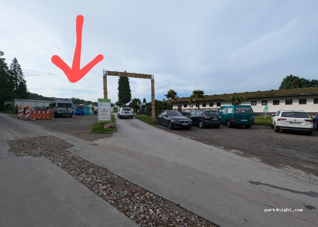 Links neben und vor der Schranke zum Campingplatz gibt es 3 - 4 Stellplätze für Camper Vans/ Wohnmobile. Check-in erfolgt über QR Code und Abmeldung bei bei parc4night.